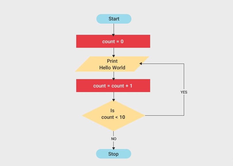 مثال: فلوچارت برنامه ای که 10 بار عبارت Hello World را چاپ کند.